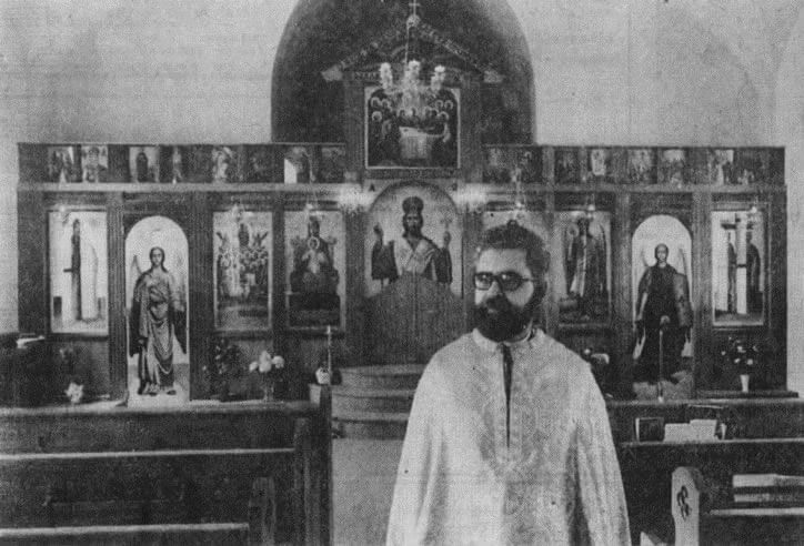 The centerpiece of the interior of the Church is the iconostasis which contains icons painted by the monks on St. Athos in Greece. Rev. Constantine Kakabelakis stands before the Iconostasis in 1978.