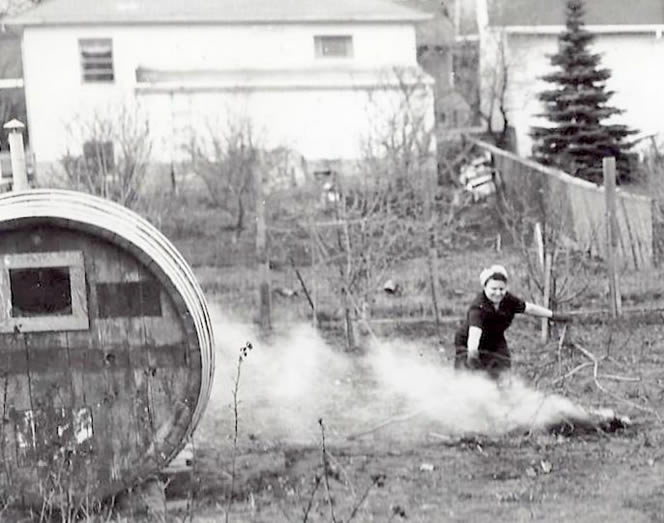 The Canadian National railway-line to the downtown train terminal, approaching from the south, passed by her vegetable garden. The large wooden barrel that served as tool shed was a prominent and memorable landmark.