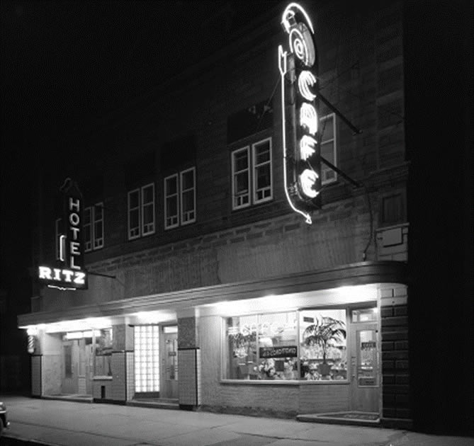 The Ritz Block initially included separate businesses that operated a hotel on the second floor, a 300-seat movie theatre on the main floor, and a basement pool hall. At that time, the Geatros family operated the Ritz Café and later a social (poker) club in the basement.