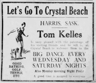 The brothers, Tom Kelles and Paul Kelles, bought the lakeside holiday resort in 1929. The resort, known as Crystal Beach, included a swimming pool, four tennis courts, 18-hole golf course, baseball diamond, picnic and camping area, rental cottages, and boating facilities. The resort was popular throughout the province for evening dances held two to three times a week in the summer in an on-site pavilion; live music was provided by the Crystal Beach orchestra. The pavilion could accommodate up to 600 couples. A large dining room with booths served meals to visitors, with fowl suppers on Sundays being very popular (Saskatoon Star-Phoenix, July 8, 1929, p. 5 and August 6, 1930, p. 7.).