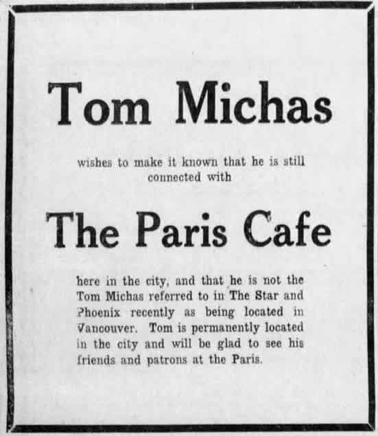 Editorial note: The “Tom Michas” who moved to Vancouver was Thomas Lucas Michas.