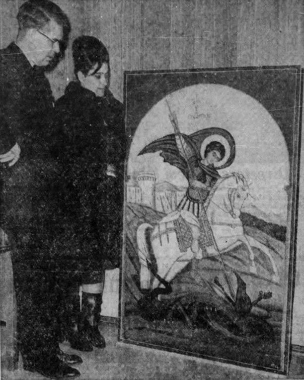 Mrs. Stefanidis says she and her husband had watched the building of the new sanctuary and wished to help in some way which would show their gratitude for the recovery of their son. They decided a painting of the church's patron saint would be a suitable and lasting tribute.