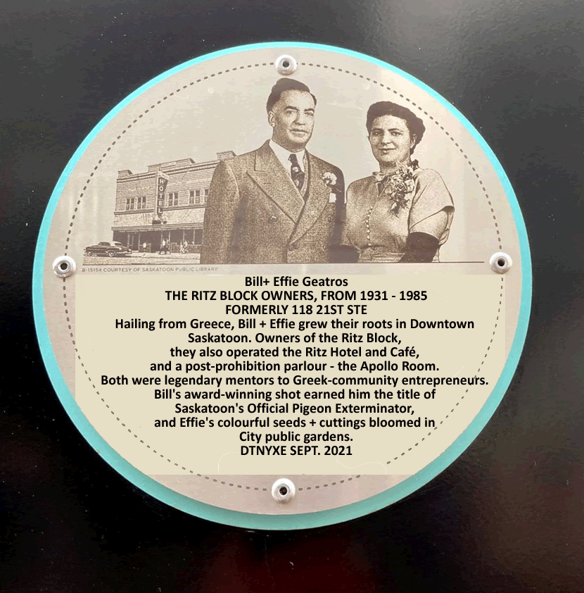 On September 24, 2021, a plaque was unveiled to remember and honour Bill (“Vasilis”) and Effie (“Eftyhia”) Geatros (“Iatridis”) as Saskatoon Downtown Legends.