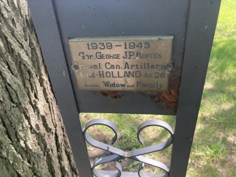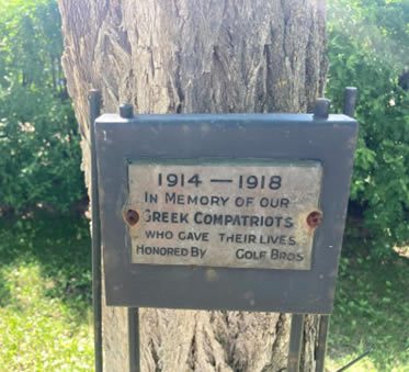 Two plaques are of relevance to Saskatoon’s Greek Community. The first is a tree and plaque (located adjacent to the Cemetery’s Greek Section) in memory of George J. P. Kortes who was killed in Holland, at the age of 26, during the Second World War. The second is a tree and plaque (located at the front entrance to the Cemetery) donated by the Golf Brothers (Gus and Bill) in memory of “our Greek Compatriots who gave their lives” in the First World War.