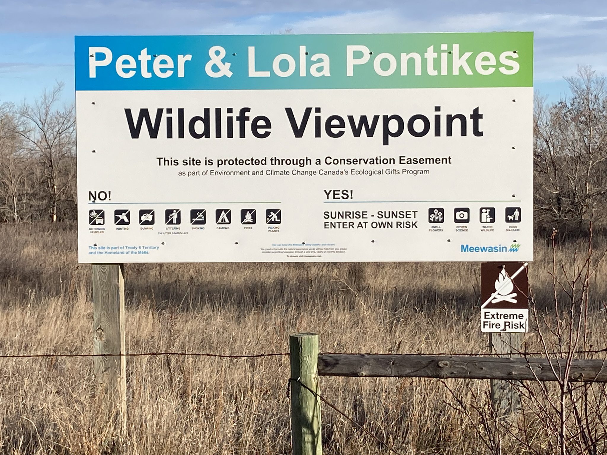 The property has been owned by the Pontikes family since the 1950s. The property has been identified as a memorial to Peter and Lola Pontikes. Peter died in 2000 and Lola died in 2014. The conservation easement ensures that the ecological features of the property will be protected in perpetuity. The property is accessible to the public but contains no major park infrastructure, other than identifying signage, a bench constructed by Meewasin, and an occasionally mowed path to the bench. The Saskatoon Nature Society has recognized this conservation easement as one of the 36 notable viewing sites in and around Saskatoon.