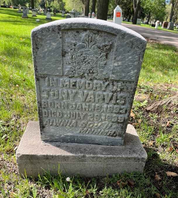 In July 1939, Tony Varvis died and was buried in a new open area in the Cemetery now identified as Block 69. Tony had been the head chef at the Elite Cafe and the owners of the restaurant, the Girgulis brothers, chose and paid for Tony’s grave site. The monument includes the logo of the Order of Ahepa; it is not known whether this logo honours Tony’s involvement in the Order and/or whether the local chapter contributed towards the cost of the monument.