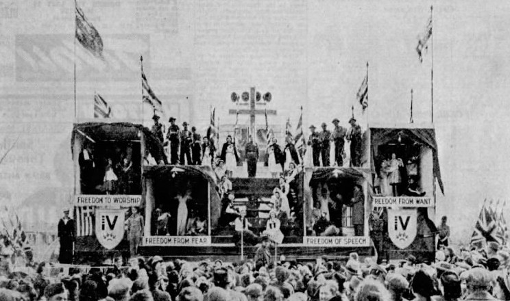 This structure (installed in Kiwanis Park, next to the Vimy Memorial) was part of the promotion of Saskatoon’s fourth Victory Loan campaign. The four compartments depicted each freedom. The Greek flag is prominently displayed (bottom left of the Tableau), likely to promote the Greek War Relief Campaign.