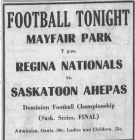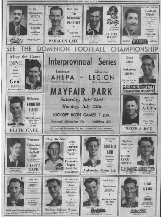 The team played a best two-out-of-three-game series against the Edmonton Legion in July 1949 for the right to play British Columbia's provincial champs. Edmonton had physically heavier and taller players than Saskatoon's. The first game was played after a heavy downpour. Edmonton won the first game, 3-0. For the second game, the field was still muddy from the previous day's rainstorm. Despite a more disciplined style of play by Edmonton, the Ahepas were able to hold the score to a 1-1 tie and therefore, forced the third game. The third game, on July 26, was described by the Saskatoon Star-Phoenix as "rough-and-ready" play. The final score was 5-3 for Edmonton who thereby became the Saskatchewan-Alberta DFA champions.